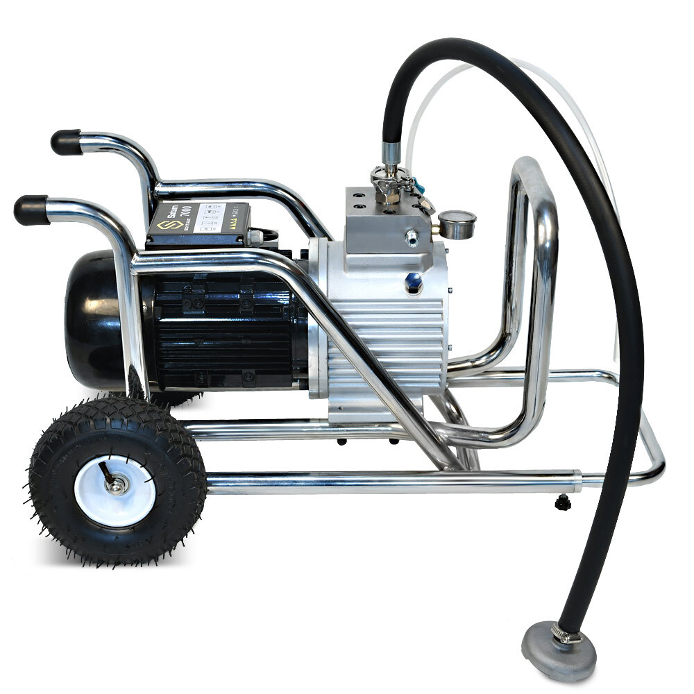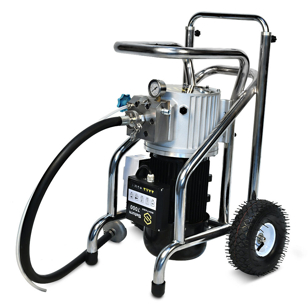 Schtaer Saturn 7000 - мембранный окрасочный аппарат для безвоздушного распыления ЛКМ низкой, средней и высокой вязкости на водной основе или на основе растворителей. Мембранный насос всасывает материал и подает его через шланг высокого давления в краскораспылитель с безвоздушным наконечником. Высокое давление обеспечивает сверхтонкую атомизацию распыления.