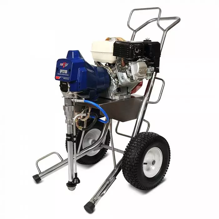 HYVST SPT 2700 - бензиновый окрасочный аппарат безвоздушного распыления. Используется в местах отсутствия доступа к электричеству или воздушному компрессору. Развивает давление до 230 бар. Аппарат применяется на открытых пространствах, на улице. Эффективно окрашивает фасады зданий, мостовые конструкции, трубопроводы, заборов и придорожных ограждений. С его помощью возможны нанесение знаков на дорогу и окраска бордюров.